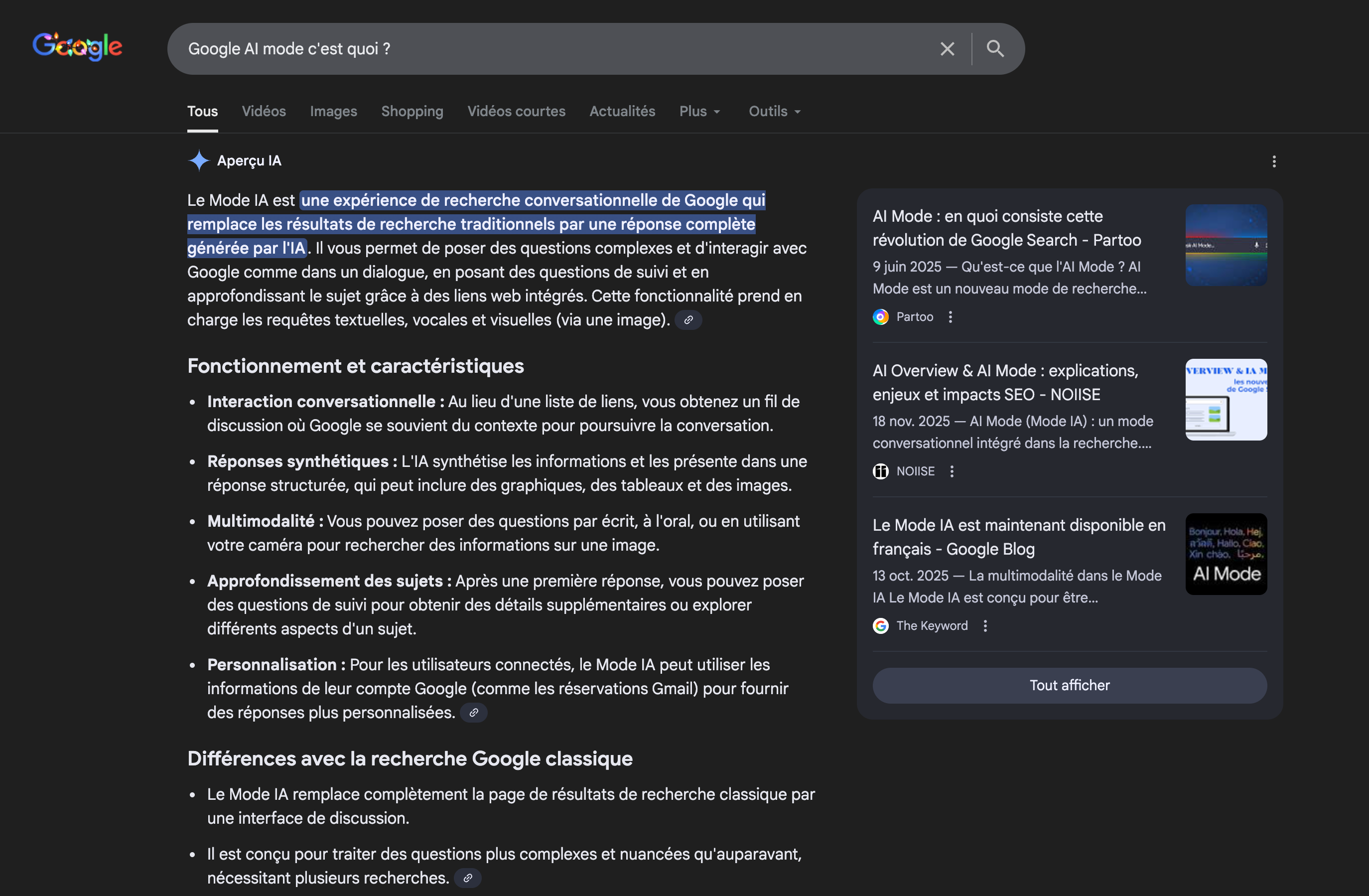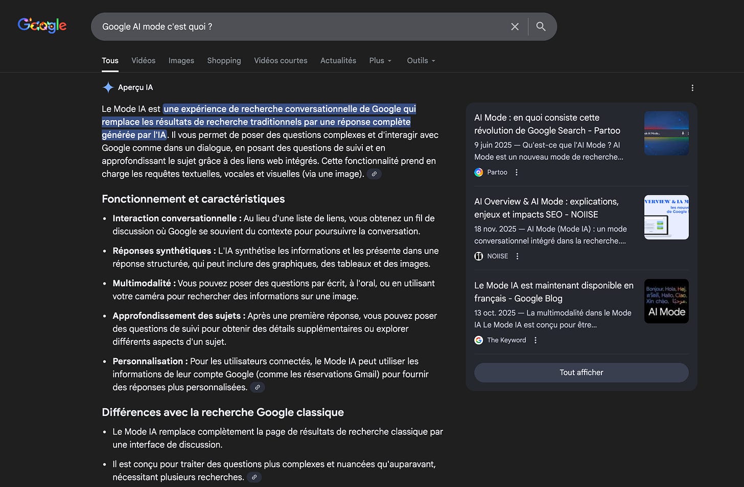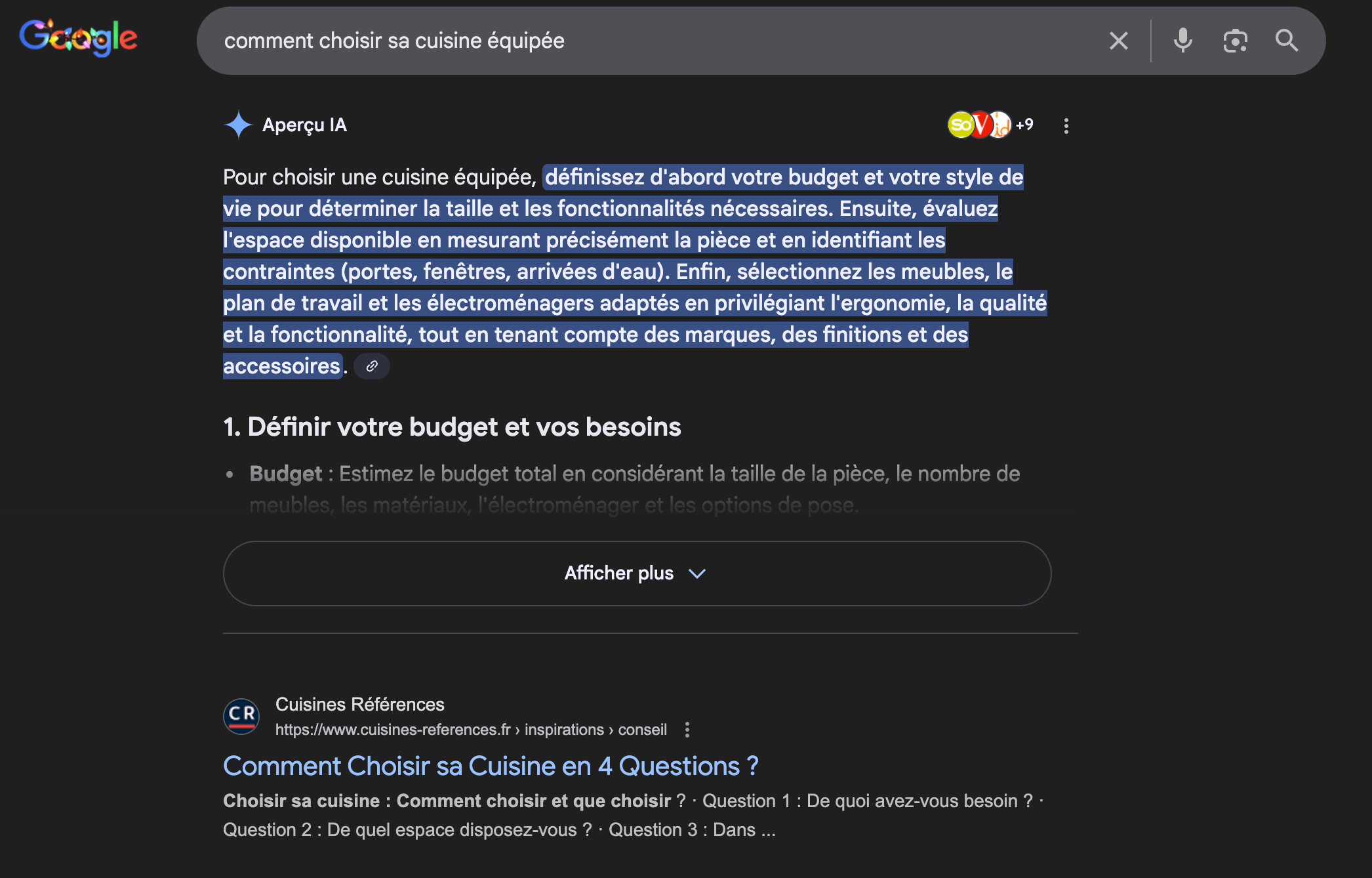 Exemple d’aperçu IA généré par Google en haut de la page de résultats (ici, une question complexe sur la cuisine). L’encadré fournit une synthèse en langage naturel, accompagnée de liens vers les sources pour “creuser” le sujet[8]. L’objectif affiché est de faire gagner du temps à l’internaute en lui évitant de parcourir manuellement plusieurs sites web.